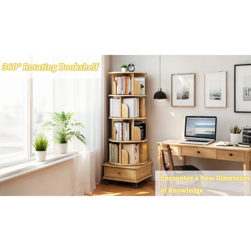 5 Tier Rotating Bookshelf 360° Display Round Spinning Bookshelf with Wheels Space-Saving Small Space Rotating Bookshelf Tower